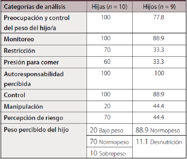 Madres con hijos varones. También se encontró una tendencia alta en las categorías monitoreo y control de la alimentación de su hijo (88.9%), 77.8% manifestó preocupación y control del peso, 44.4% reportó manipulación y percibir riesgos asociados a la mala alimentación. Además, es importante señalar que 33.3% mencionó que restringe a sus hijos ciertos alimentos y los presionan para que coman. Finalmente, en lo que respecta al peso percibido de sus hijos, 88.9% de las madres los percibieron normopeso y 11.1% con desnutrición; no obstante, realmente 66.7% era normopeso, 22.2% tenía sobrepeso y 11.1% obesidad. Por tanto, 44.4% de las madres percibió adecuadamente el EN de sus hijos y, en el 55.6% restante, su percepción no fue congruente con la realidad, con subestimación del peso y nula percepción de su ETB (desnutrición crónica). Algunos fragmenos del discurso de las mujeres con hijos varones fueron los siguientes: