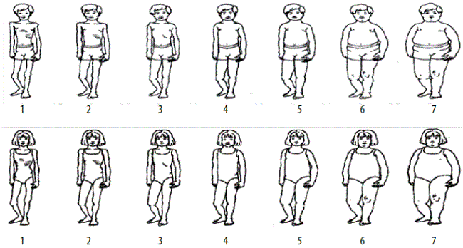 Siete Figuras de Collins. Se trata de una escala gráfica de siluetas femeninas para las niñas, y masculinas para los niños, que contiene siete figuras humanas ordenadas de menor a mayor complexión (Collins, 1991). Dichas siluetas se clasifican como: infrapeso (1), bajo peso moderado (2), bajo peso ligero (3), normopeso (4), sobrepeso ligero (5), sobrepeso moderado (6), y obesidad (7). Los participantes eligen una figura para autodescribirse (Real) y otra a la que les gustaría parecerse (Ideal), véase Figura 1. Además se les solicitó a los niños la elección de aquella figura percibida como: “enferma”, “sana”, “bonita”, “fea”, “la que te gustaría parecerte” y “la que no te gustaría parecerte”. En primera instancia, esta escala evalúa el grado de satisfacción con la IC, con base a la diferencia entre la forma corporal que desea tener un sujeto vs. la forma corporal que cree tener (Sánchez y Ruiz, 2015).