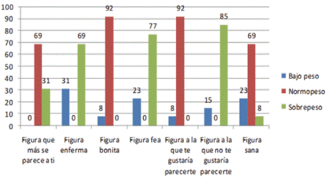 Cuando se comparan los resultados de esta investigación con los de Sánchez y Ruiz (2015), que igualmente aplicaron las figuras de Collins, se encontraron algunas coincidencias. Respecto a la identificación de la figura a la que les gustaría parecerse, los niños de este estudio eligieron las indicativas de normopeso, lo cual puede dificultar la percepción de riesgo y evidencia el empleo en los niños de mecanismos de defensa de negación. Igualmente, el hecho de que percibieran negativamente las figuras indicativas de sobrepeso (en tanto enferma, fea, o figura a la que no les gustaría parecerse), evidencian INC y autoestima disminuida.