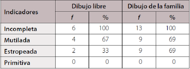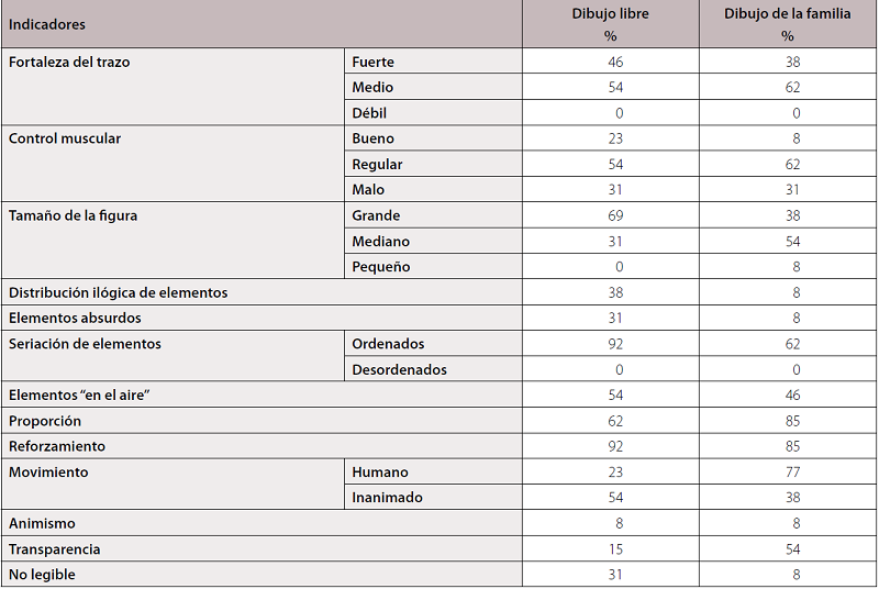 Para la interpretación de los dibujos se siguieron los indicadores siguientes: contenido y temas, formales o estructurales (legibilidad, fortaleza del trazo, reforzamiento, control muscular, tamaño de la figura, proporción, distribución en el plano o distribución ilógica de elementos, elementos absurdos, elementos en el aire, seriación de elementos, movimiento humano, animal e inanimado, transparencia, animismo, antropomorfismo, rotación de la hoja), de color (pobre uso, adecuación, inusual, seriaciones, preferencia cromática), así como de la ejecución de la figura humana (completamiento, mutilaciones, primitivismo, estropeo, expresividad). Estos indicadores se distribuyeron en tablas, evaluando la tendencia de su comportamiento a través de porcentajes, según su presencia en los dibujos.