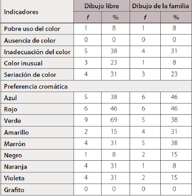 En el dibujo de la familia, la inadecuación del color asociada a la figura humana estuvo presente en cuatro niños y la seriación en solo tres casos. La preferencia cromática dominante en la elaboración de las casas fue el color azul (seis niños), indicativa de la presencia de ansiedad basal, quizás asociada a la existencia de conflictos y tensiones familiares. Igualmente, a partir del uso del color rojo en la ejecución de las figuras humanas, sobre todo la propia, se confirmó la presencia de hostilidad en seis de los niños evaluados.