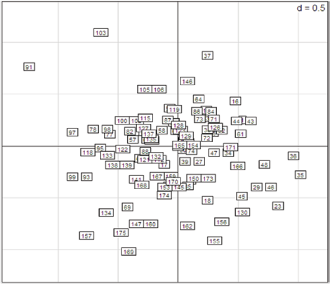En la Figura 2 se muestra la representación en función de los individuos, observándose si existían diferencias o similitudes entre niños. Por ejemplo, el niño con el código 103 fue diferente a la mayoría de los otros niños, mientras que los niños 105 y 106 fueron similares, al igual que los niños 147 y 160.