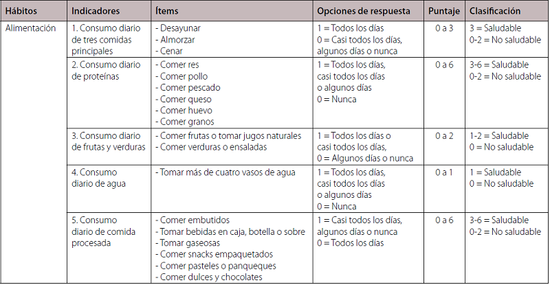 Lo que se reporta en los estudios suelen ser porcentajes de cada opción de respuesta para cada hábito evaluado, constituyendo informes extensos en los que es difícil identificar necesidades de intervención. En encuestas nacionales o estudios en instituciones educativas se expone el porcentaje de niños que comen frutas diariamente, de los que toman gaseosas, o de los niños que reportan ver más de dos horas al día la televisión, por citar solo unos ejemplos. Sin embargo, a partir de las múltiples posibles combinaciones de respuestas que pueden dar los sujetos a la cantidad y variedad de ítems que evalúan este tipo de cuestionarios, no es posible establecer clasificaciones en términos de HS o no saludables, y por tanto se hace necesario crear indicadores que sinteticen esa información, facilitando su interpretación, comparación entre grupos y su análisis conjunto con otras variables de tipo sociodemográfico.