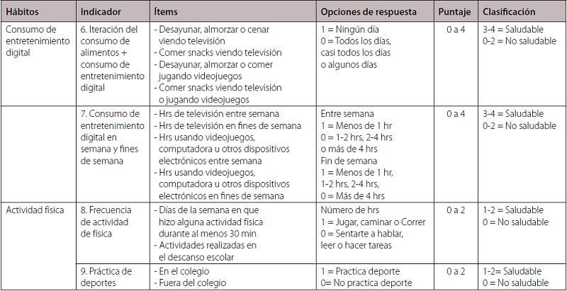 A pesar del alto volumen de estudios interesados en evaluar los hábitos de salud (HS) relacionados con el sobrepeso y la obesidad infantil, es difícil encontrar consenso respecto a su forma de medición. Los instrumentos más comúnmente empleados para evaluar los HA en niños abarcan los registros de alimentación (e.g., de 24 h o de 3-4 días), la historia dietética y los cuestionarios de frecuencia del consumo de alimentos (CFCA), siendo estos últimos los más utilizados, a pesar de las limitaciones que se les atribuyen (Instituto de Nutrición de Centroamérica y Panamá [INCAP], 2016; National Cancer Institute [NCI], 2014). Los CFCA usualmente se interesan por evaluar los alimentos consumidos y no los nutrientes ni la calidad de la dieta, por lo que suelen emplearse −dado su costo-eficiencia− en estudios poblacionales transversales, ya que permiten capturar la ingesta de alimentos a corto, mediano y largo plazo, aunado a que -para ser contestados− requieren de memoria genérica y no específica. Además, los CFCA pueden ser mejores que los registros de alimentación de 24 h para evaluar el consumo de alimentos que se ingieren esporádicamente y no como parte de la dieta habitual, debido a que indagan sobre un periodo de tiempo y no sobre el último día (Bel-Serrat et al., 2012; INCAP, 2016; NCI, 2014). Y, al respecto, la literatura señala que entre los 8-12 años de edad los niños son más precisos en el reporte de su ingesta alimentaria que sus padres (Burrows, Martin y Collins, 2010; Kolodziejczyk, Merchant y Norman, 2012).