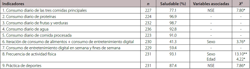 En la Tabla 3 se presenta la proporción de niños con HS en cada uno de los indicadores propuestos. En la mayoría de estos los niños presentaron HS, excepto en los indicadores 6 y 7, los cuales refieren a la iteración entre el consumo de alimentos y el consumo de END entre semana y fines de semana, respectivamente. El NSE estuvo asociado con los indicadores 1 y 9, referentes a consumir las tres comidas principales y a la práctica de deporte, respectivamente. El sexo mostró asociarse con los indicadores 6 y 8 (frecuencia de AF). Además, este último también se asoció a la edad del niño. En el indicador 3, una alta proporción de niños tenía HS, por tanto se decidió no incluir este indicador en el ACM, ya que las frecuencias observadas no cambiaron según las variables sociodemográficas.