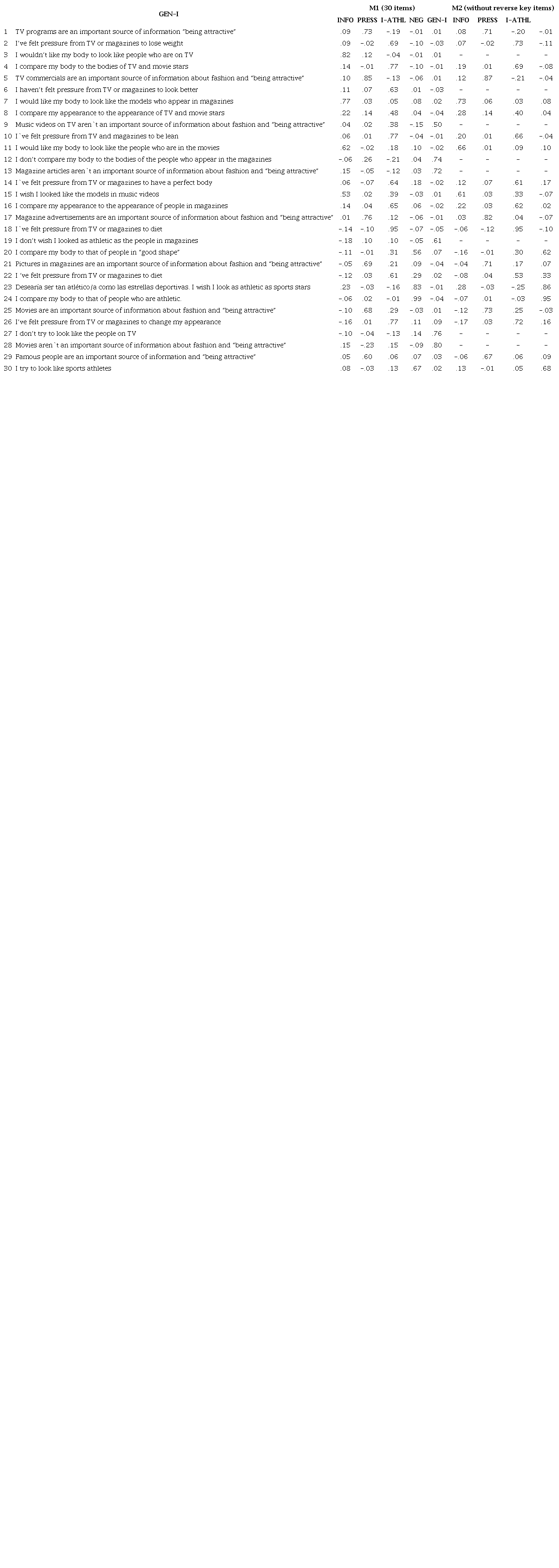 After performing an EFA with Promax rotation, a five-factor model explaining 61.20% of the variance was obtained. All items (30) yielded a correlational ratio greater than .40 in at least one factor. The first factor generated upon rotation was responsible for 39.40% of the variance and mainly included the items corresponding to the category proposed by the initial model (Thompson et al., 2004), such as the Pressure factor (see M1, Table 1). It should be noted that, contrary to expectations, some items that included the verb “compare” (4, 8 and 16) in their wording were a part of this factor, instead of the General Interiorization factor theoretically proposed by Thompson et al. The second factor is called Information, its items coincide, and it is responsible for 10.04% of the explained variance. The exception of reversed key items should be noted, which, as can be observed in the table 1 (see M1), have tended to form their own consistent single factor. The third factor is responsible for 5.40% of the variance and groups items related to the internalization of an athletic image. Again, the same phenomenon occurred with reverse-keyed items. The fourth factor does not match any of those proposed by Thompson et al. In this case, all items with a negative wording have grouped together, forming a single factor responsible for 4.00% of the explained variance. Finally, in this first model, the fifth factor groups items designed to assess the internalization of the aesthetic models at overall level. This factor accounts for 3.20% of the variance and differs from that expected according to the initial theoretical model (see M1, Table 1).