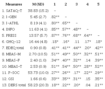 Suitable levels of internal consistency of the scores obtained by applying the SATAQ-3 (α = .81) were observed. Results were similar to those obtained in the different subscales: Pressure (α = .82), Information (α = .82), Internalization-athletic (α = .82), and Internalization-general (α = .82). The results of the correlations between the different factors of SATAQ-3 indicate that all factors were highly interrelated (Table 2), with range varying between .80 and .87. The Pressure factor (Factor 4) and SATAQ-3 obtained the maximum correlation (r = .87, p < .01).