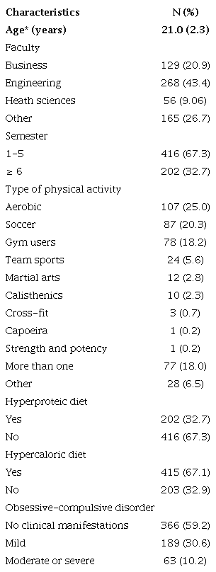 Mean age was 21.0 years (SD = 2.3), most of the sample was part of the Engineering Faculty, and most of the students were in their fifth semester. The most practiced PA was aerobic, for example: running (excluding athletics), cycling, and water-related sports. Thirty-three percent of the surveyed population had a high-protein diet. Of all students, 31.6% consumed protein supplements one or more times a week. Additionally, 10.2% had a moderate or severe risk of having OCD (Table 1).