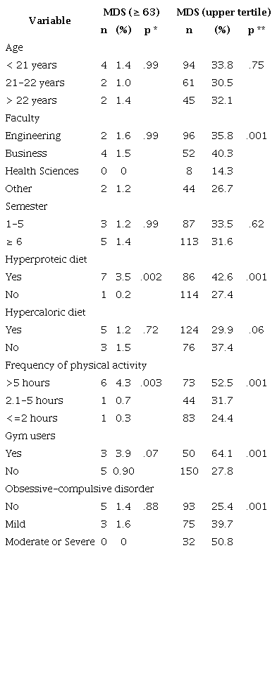 Based on the cut-off score of 63 points, 1.29% of male students of a Peruvian private university had MDS (CI 95% = 0.40-2.20%). MDS associated factors had similar results based on the two assessments applied (Table 2). A hyperproteic diet and physical activity frequency were associated with MDS considering a cut-off score of 63 points. No association with age, faculty, academic semester, hypercaloric diet, gym frequency or OCD presence (p > .05) were found in the bivariate analysis. With the MASS upper tertile, faculty, hyperproteic diet, physical activity frequency and OCD was associated with MDS. No association with age, semester, and hypercaloric diet were found in the analysis.