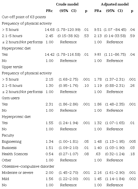 We found an association between MDS and a hyperproteic diet (PRa = 9.8; CI 95% = 1.1- 86.7; p = .04) and performing PA over five hours a week (PRa = 9.5; CI 95% = 1.1-84.4; p = .04) in the adjusted model (Table 3). Considering the MASS upper tertile, we found an association of MDS with performing PA over five hours a week (PRa = 1.8; CI 95% = 1.4-2.3; p = .001), gym frequency (PRa = 1.9; CI 95% = 1.5-2.3; p = .001), hyperproteic diet (PRa = 1.3; CI 95% = 1.1-1.6; p = .01), studying in a Engineering (PRa = 1.5; CI 95%: 1.1-1.9; p = .005) or Business faculty (PRa = 1.4; CI 95% = 1.0-1.9; p = .03), and presenting moderate-severe (PRa = 2.2; CI 95% = 1.6-2.9; p = .001) or mild OCD (PRa = 1.4; CI 95% = 1.1-1.8; p = .002).