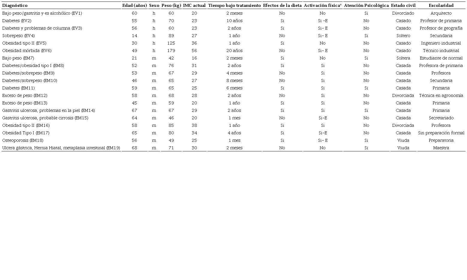 Un total de 19 entrevistas semiestructuradas fueron realizadas a seis hombres y trece mujeres. Dos varones iban acompañando a sus esposas, y de estos solo uno estaba en tratamiento nutricional. Un hombre era adolescente con obesidad que iba acompañado de su madre, quién también estaba en tratamiento nutricional. Los varones llevaban, en promedio, bajo tratamiento nutricional 2.2 años, mientras que las mujeres solo reportaron un año.