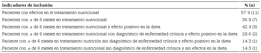 Los pacientes que tuvieron efecto en el tratamiento nutricional fueron el 58%, estos pacientes integraban la actividad física como parte del tratamiento integral y representaban un 82%. Los pacientes que no mostraban un diagnóstico de cronicidad, pero tuvieron efectos en el tratamiento nutricional fueron el 10.5%. El promedio de tiempo en tratamiento nutricional de estos pacientes fue de 2.1 años en promedio. Los padecimientos asociados a modificaciones dietéticas fueron diabetes, osteoporosis y bajo peso en un periodo de tiempo menor o igual a 6 meses, el 42.9 % de estos pacientes tuvieron efectos positivos en sus prácticas dietéticas. (Véase Tabla 2).