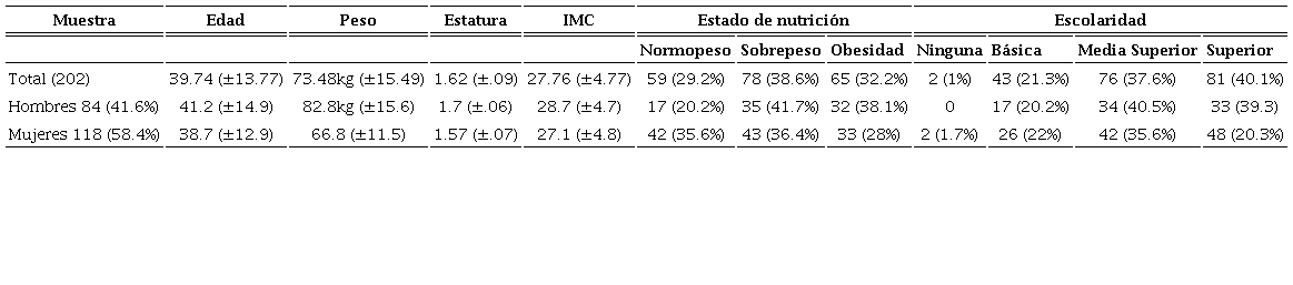 De la muestra de 202 participantes se contó con 118 (58.4%) mujeres y 84 (41.6%) hombres. Del total de los participantes, 50 (24.8%) indicaron ser solteros y 107 (53.0%) casados. Con Medad = 39.74 años (DE = 13.77), con una Mpeso = 73.48 kilogramos (DE = 15.49) y la Mestatura fue de 1.62 metros (DE = 0.09), correspondiente a una MIMC = 27.76 kg/mtr2 (DE = 4.77). La muestra fue distribuida según su IMC en: normopeso (n = 59), sobrepeso (n = 78) y obesidad (n = 65). Con respecto a la escolaridad de los participantes, 2 (1%) indicaron no contar con escolaridad alguna, 43 (21.3%) educación básica, 76 (37.6%) educación media y 81 (40.1%) educación superior (Tabla 1).