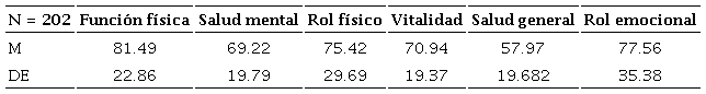 En la Tabla 2 se pueden observar las puntuaciones promedio obtenidas por la muestra general en cada una de las dimensiones de CVRS, donde FF predominó con una puntuación considerada como muy buena; consecutivamente, las dimensiones RE, RF, VT y SM presentaron puntuaciones consideradas como buenas; por último, la puntuación en la dimensión SG (57.97) fue considerada regular.
