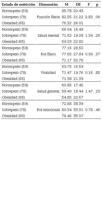Calidad de vida relacionada con la salud en adultos con normopeso, sobrepeso y obesidad