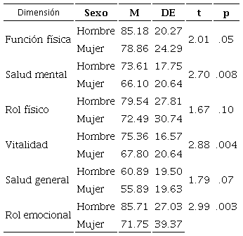 En la Tabla 4 se puede observar la comparación entre hombres y mujeres mediante el estadístico t de Student, en donde el grupo de hombres presentó mayores puntuaciones en todas las dimensiones de calidad de vida; sin embargo, sólo en las dimensiones FF, SM, VT y RE se encontraron diferencias estadísticamente significativas a favor de los hombres.