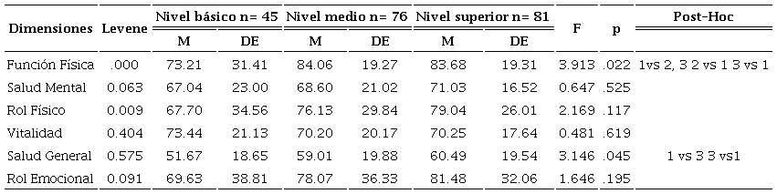 En cuanto a los análisis por sexo se encontraron resultados similares a los de Medrano-Vázquez et al. (2014) y Salazar et al. (2016), en donde los hombres presentaron puntuaciones más elevadas en todas las dimensiones de CVRS en comparación con las mujeres, las cuales obtuvieron menor puntuación en áreas tanto físicas como mentales, no obstante, al realizar el análisis de t Student sólo se encontraron diferencias estadísticamente significativas en las dimensiones de FF, SM, VT y RE. Cabe mencionar que las puntuaciones obtenidas por las mujeres se encuentran en un rango considerado como buena CVRS, salvo la dimensión SG (55.88), que se considera como regular. En el caso de la comparación por medio de ANOVA entre los grupos por nivel educativo se presentaron diferencias significativas en las dimensiones de FF y SG, en la primera dimensión tanto el grupo con nivel educativo medio y superior, presentaron mayor puntuación en comparación con el grupo de nivel educativo básico (o menor), en la segunda dimensión solo se encontró diferencia entre los grupos con nivel básico y superior, estos fueron resultados similares a los ya reportados por Barajas, Robledo, Tomás, Sanz, García y Cerrada (1998), en otras palabras, tal y como lo indica De Vincezi y Tudesco (2009), la educación presenta una relación con la CV, ya que tanto la educación formal como no formal, permite el desarrollo de habilidades que favorecen la búsqueda de recursos que permitan mejorar las condiciones de bienestar.