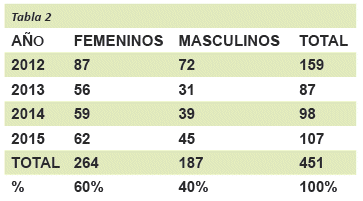 Durante el período de estudio fueron ingresados a la UTI-P un total de 451 pacientes, siendo la gestión con mayor número de ingresos el año 2012 con 159 pacientes (ver tabla 1), el sexo predominante fue el femenino con 60% (ver tabla 2), el grupo etario con mayor número de pacientes fue de 1 mes a 2 años con 69% del total (ver tabla 3).