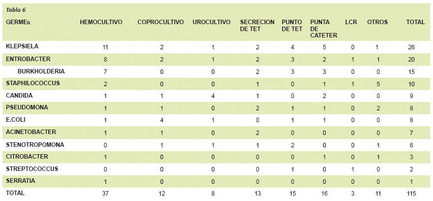 En cuanto a los resultados de los cultivos, del total de pacientes ingresados en la UTI-P, se encontraron 115 cultivos positivos de los cuales los hemocultivos representan el mayor número 37 (ver tabla 6), seguido de cultivos de punta de catéter y punta de TET. Los gérmenes aislados con mayor frecuencia en el global de los cultivos fueron Klebsiella con 26 cultivos positivos, seguidos de Enterobacter y Burkholderia. (ver tabla 6). Cabe mencionar que el germen más frecuente en coprocultivo fue E. Coli, y C. albicans el más común en urocultivos (ver tabla 6).