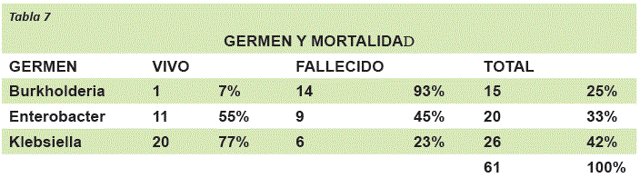Respecto al día de aparición del cultivo positivo, fue más frecuente entre el 3er y 8vo día (ver gráfico 1). Del global de cultivos positivos, los 3 gérmenes más frecuentes representaron un total de 61 cultivos, considerando que el porcentaje de pacientes fallecidos fue mayor en aquellos en cuyo cultivo se aisló Burkholderia, 93% de mortalidad, seguido de Enterobacter y Klebsiella (ver tabla 7). Tomando en cuenta la sensibilidad del antibiograma en estos 3 gérmenes sólo Meropenem logra buenos resultados terapéuticos in vitro en todos ellos, seguido de Imipenem y amikacina. Es muy importante hacer notar que Burkholderia sólo fue sensible a Meropenem y Cotrimoxazol. Considerando el resultado de resistencia en el antibiograma, el antimicrobiano con la mayor resistencia fue Gentamicina. Es importante resaltar que los resultados de resistencia en los antibiogramas fueron considerables para Cefotaxima, Ceftazidima y Amoxicilina/ Ácido Clavulánico (ver tabla 8). En aquellos pacientes cuyo resultado de cultivo fue positivo, 46 estuvieron en asistencia respiratoria mecánica y 38 recibieron aminas endovenosas (ver tabla 9).