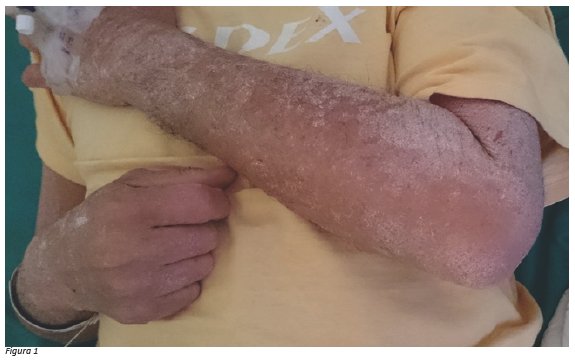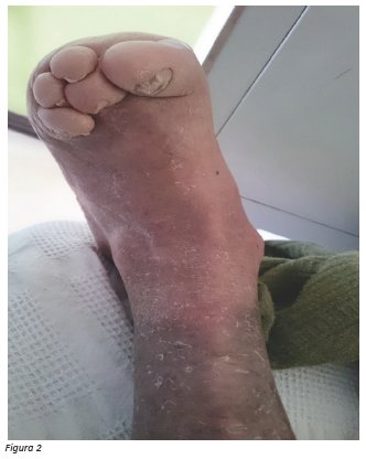 Al examen se aprecia placas que se descaman finamente en frente, dorso y extremidades (Figura 1), además incapacidad funcional, deformidad articular de pie izquierdo, acompañado de onicolisis y poliartralgias (Figura 2).