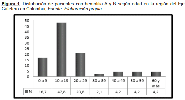 El proyecto identificó 51 pacientes en el eje cafetero con diagnóstico de hemofilia se excluyeron 3 personas, una por falta de información y dos por no haber aceptado el consentimiento informado. 48 pacientes cumplieron criterios de inclusión, estos fueron atendidos en cinco clínicas distribuidas entre Pereira, Armenia y Manizales. La edad media de la población fue 21,3 ± 15,52 años (rango: 4-70 años); la distribución se muestra en la figura 1 (ver figura 1).