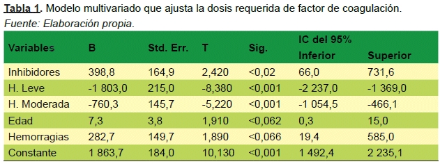 Se realizó un modelo multivariado de regresión logística para ajustar variables que pudieran explicar la dosis requerida del factor. El coeficiente de determinación R2 reportado fue 0.80; el modelo muestra que el desarrollo de inhibidores, el antecedente de un sangrado previo, el diagnóstico de hemofilia severa y cada año de edad cumplido aumenta la dosis de factor requerido para el control de su enfermedad, mientras que tener concentraciones de factor >1% disminuyó las dosis requeridas para el manejo de la patología como se puede observar en la tabla 1 (ver tabla 1).