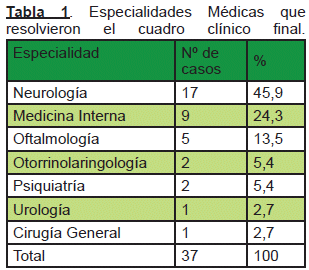 Del total de casos descartados, en los que se logró obtener información del egreso, un 51,5% corresponde a otros trastornos neurológicos y un 45,9% a patologías de otras especialidades entre las que destacan las derivadas de la Medicina Interna (Tabla 1).