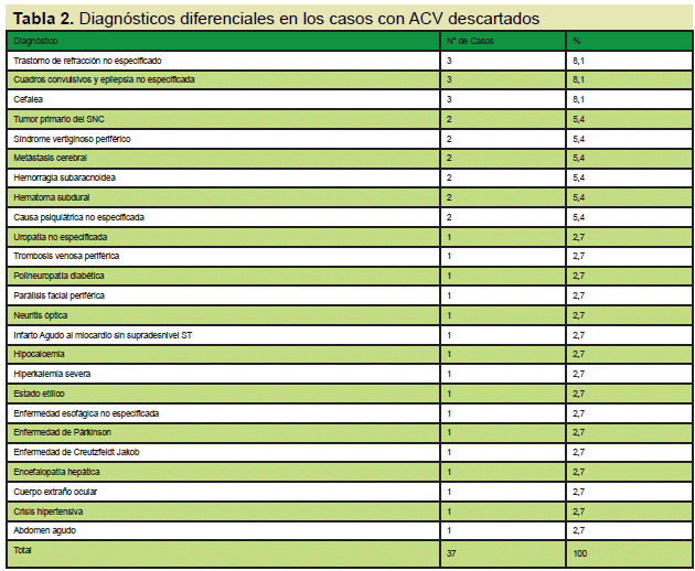 Los cuadros neurológicos que fueron de similares características clínicas que el ACV, fueron en su mayoría los tumores del sistema nervioso central (23,5%), las cefaleas (17,6%) y los síndromes convulsivos (17,6%). El detalle de los diagnósticos de egreso se encuentra en la Tabla 2. (ver tabla 2)