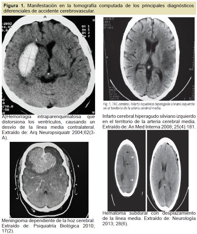 En nuestro estudio no se reportó ningún caso. Parece ser que las recomendaciones de medición de la glicemia en pacientes que presenten esta sintomatología, especialmente adultos mayores, han sido bien asimiladas por el personal de atención primaria19. En la Figura 1 se presentan los principales diagnósticos diferenciales de los accidentes cerebrovascular y su manifestación en la tomografía computada.