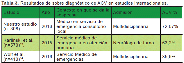 El estudio de Oostema et al. en Michigan (USA) sugirió que la falla en el diagnóstico se debe a un mal uso de los documentos de screening para ACV15. Fischer et al. considera como posible causa al sobrediagnóstico a una falencia en la educación de los médicos en cuanto al reconocimiento clínico, siendo compensado por el uso de "herramientas" diagnósticas16. Karliñski et al. en Polonia, concluye que el diagnóstico en el servicio de emergencia posee una gran sensibilidad. Sin embargo, la especificidad no es alta, mostrándose una tendencia al sobreuso del diagnóstico con el fin de justificar la derivación a neurología13. Contrario a lo que se presumía, los resultados de este estudio reflejan una tasa de casos sospechosos de ACV que fueron descartados (26,9%) similar a las encontradas por otros autores.