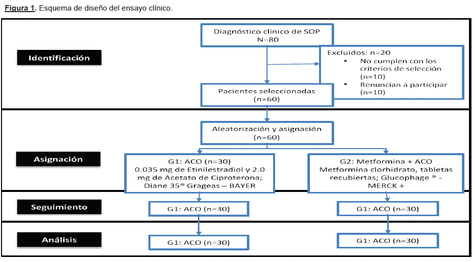 La muestra fue dividida en 2 grupos homogéneos de 30 pacientes por grupo: grupo de ensayo 1 (GE-1): monoterapia ACO (21 grageas por ciclo que contienen: 0,035 mg de etinilestradiol y 2,0 mg de acetato de ciproterona; Diane 35® Grageas - BAYER); Grupo de ensayo 2 (GE-2): metformina 500mg/día más ACO (metformina clorhidrato, tabletas recubiertas; Glucophage ® -MERCK). La asignación de los sujetos de estudio en cada grupo, fue realizada utilizando el método de aleatorización restrictiva o equilibrada, asegurándonos de que el número de sujetos de cada grupo del ensayo sea el mismo, para facilitar el análisis de los resultados20; calculándose con este tamaño muestral el poder del estudio (power=0,0912), el error Alfa (<x=0,051) y beta ((3=0,95) mediante el software PASS 2008®, conforme el modelo propuesto para pruebas secuenciales en grupos homogéneos, descrito por O'Brien (1979) ; respetando el tamaño muestral mínimo para ensayos clínicos de la Declaración CONSORT (acrónimo de CONsolidated Standards Of Reporting Trials), actualizada el 201021. (Ver Figura 1)