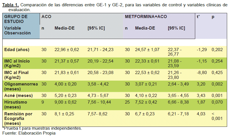 Luego de analizados los datos, observamos que el 50% de las pacientes fueron estudiantes (n=30) y 50% fueron trabajadoras universitarias aseguradas (n=30) (entre docentes y administrativas), de las cuales la distribución de las estudiantes fue mayor en el grupo de la Monoterapia con ACO, y por el contrario el grupo de trabajadoras universitarias aseguradas estuvo en mayor proporción incluida en el tratamiento combinado de ACO+Metformina; sin embargo, la edad media de ambos grupos fue similar; con un 22,96±0,62 años en el grupo de la monoterapia; y de 24,57±1,07 años en el grupo de la terapia combinada; y si bien existe una diferencia, esta no es estadísticamente significativa (p=0,202). De la misma manera, el Índice de Masa Corporal (IMC) al inicio y al final del estudio, no tienen una diferencia significativa entre ambos grupos (p=>0,05), asegurándose de esta manera que son 2 poblaciones equiparables y comparables en relación a estas variables de estudio. (Ver Tabla N°1)