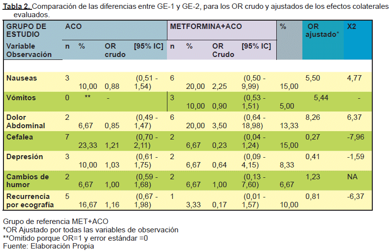 Se realizó el cálculo de OR crudo mediante regresión logística binaria, para analizar el riesgo de padecer estos efectos colaterales por la pertenencia a un grupo de estudio específico fue comprobada para la cefalea y el cambio de humor en el grupo que recibió solo ACO, así como las náuseas y dolor abdominal en el grupo que recibió terapia combinada (OR crudo=>1). El OR ajustado para todos los efectos adversos muestra niveles de riesgo para las náuseas, vómitos, dolor abdominal y los cambios de humor; considerando el grupo que recibió terapia combinada como referencia para el análisis (OR ajustado=>1), corroboradas por la prueba de Chi-2 (X2) para la asociación estadística entre las pertenencia a un grupo específico de estudio y la presencia o ausencia del efecto colateral (X2=±1), observando el efecto protector de la terapia combinada frente a la cefalea (X2= -7,96) y la depresión (X2= -1,59). (Ver Tabla N° 2)
