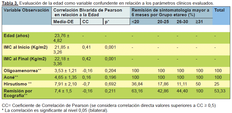 Al igual que la anterior, la clínica remitió marcadamente en menos tiempo en el grupo que recibió la terapia combinada, en todos los parámetros evaluados (oligomenorrea, acné, hirsutismo), estos hallazgos son contrarios a los hallazgos reportados por Iwata et al (2015) comparó 3 grupos: el grupo 1 recibió ACO (etinilestradiol 35 μg, ciproterona 2mg), el grupo 2 recibió metformina (850mg/12h) y el grupo 3 ACO+Metformina , reportando una mayor reducción del acné y el hirsutismo (escala de Ferriman -Gallwey Ferriman) a los 6 meses de seguimiento en el grupo que recibió solo ACO. Este aspecto es muy importante, considerando que las pacientes acuden en primer lugar por estos signos clínicos y no así por una valoración específica del SOP, por lo que la aceptación del tratamiento es mayor, por el hecho de la observancia de la remisión de los síntomas y signos característicos de la patología.