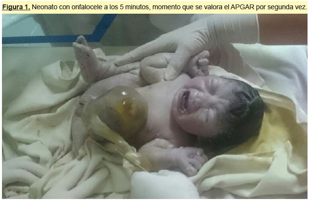 Gestante de 46 años proveniente de la provincia Tapacari de ocupación agricultora, indica no haber realizado controles prenatales, antecedentes gineco-obtetricos G: 4 P:3 C:1 A:0 no indica otros de importancia. Recién nacido de sexo femenino de 2 800 gr con APGAR de 7 a los 5min de vida, se evidencia onfalocele de aproximadamente 8cm de diámetro y ninguna otra particularidad aparente en fisonomía (ver figura 1).