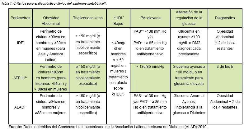 En 1998 la Organización mundial de la salud (OMS) describe dicha entidad por la presencia de Diabetes tipo 2, alteración de la tolerancia a la glucosa, resistencia a la insulina o hiperglicemia en ayunas coincidiendo con al menos dos de los siguientes criterios: presión arterial ≥140/90mmHg; triglicéridos ≥150mg/dl o colesterol-lipoproteína de alta densidad (HDL) <35mg/dl en hombres, <39mg/dl en mujeres; índice cintura/cadera >0,90 en hombres, >0,85 en mujeres o IMC >30kg/m2; microalbuminuria ≥20μg/min o índice albúmina/creatinina ≥30mg/g4,5. La Asociación Latinoamericana de Diabetes (ALAD) determinó que el perímetro abdominal en varones >94cm y en mujeres >88cm es considerado en el diagnóstico del Síndrome Metabólico, además ha descrito que factores como el estilo de vida, etnia y urbanización influyen en la alta incidencia del síndrome6,7.