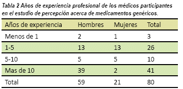 Se entrevistaron 80 médicos, 59 hombres y 21 mujeres, en ejercicio clínico (consulta externa o emergencias), 53 de ellos eran mayores de 31 años (tabla 1), 41 eran médicos generales y 39 tenían alguna especialidad clínica. La mitad de los médicos tenían más de 10 años de experiencia profesional y solo 3 tenían menos de un año de experiencia profesional. (tabla 2)