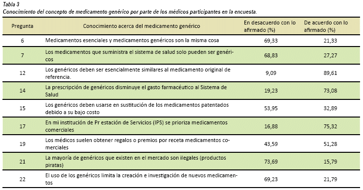 Se conoce como medicamento genérico aquel que es técnicamente igual al primer medicamento investigado con esa composición química, denominado medicamento innovador. Un laboratorio investigador desarrolla una molécula innovadora con usos terapéuticos e inicia su comercialización con una marca registrada, esta nueva molécula tiene reserva o patente de propiedad intelectual durante veinte años, posteriormente otros laboratorios empiezan a fabricar la misma molécula y a comercializarla con la Denominación Común Internacional (DCI) o con otras marcas secundarias. Estos productos, con la misma composición, despectivamente llamados copias, son los que deben denominarse productos genéricos, en algunos países se conocen como productos similares o como genéricos intercambiables (México), la Organización mundial de la Salud sugiere que se les denomine medicamentos de origen multifuente. El objetivo de este trabajo fue el de identificar el concepto y la opinión que, sobre el medicamento genérico, tiene el médico que trabaja en el Sistema General de Seguridad Social en Salud (SGSSS) de Colombia, sistema que atiende más del 90% de la población colombiana . Se espera que la información obtenida permita orientar campañas de capacitación y de información acerca de la bioequivalencia de medicamentos y sustentar con cifras, la importancia de lograr una racionalización del uso de los medicamentos por parte de médicos, farmacéuticos, y pacientes; además contribuir al control del uso innecesario de sustancias farmacológicas más costosas.