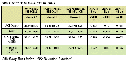 There is no significant difference in the Body Mass Index (BMI), gestational age and surgical time among the three study groups (p value => 0,05). (See Table N° 1)