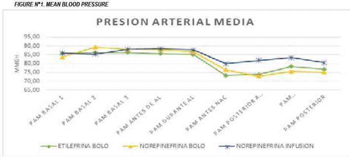 The baseline values of mean arterial pressure (MAP) taken before the administration of local anesthetic are similar values Group E MAP = 86,17 ± 5,9 mmHg. Group NB MAP = 88,08 ± 6,97 mmHg. NI PAM group = 88,10 ± 9,15 mmHg. P value between group E and group NB is 0,175; P value between group E and group NI is 0,252; P value between NB group and NI group is 0,993. The mean blood pressure before birth, after birth, modified with oxytocics and at the exit of the operating room is statistically significant in groups E and Group NI (P value: 0,000,0,000,0,001 and 0,004 respectively) and in group NB and Group NI (P value: 0,013, 0,000, 0,000 and 0,000 respectively). Regarding group E and Group NB, there is no significance between the two groups (P value: 0,005,0,288,0,053 and 0,207 respectively). Figure N ° 1