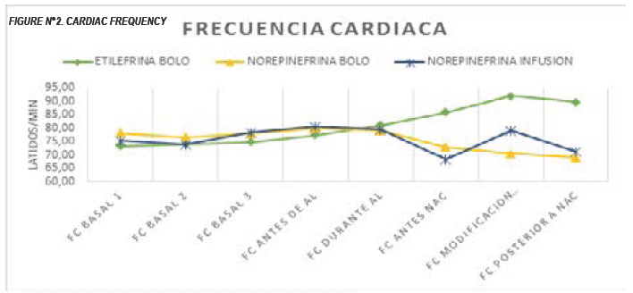 The best controlled heart rate occurred in the NB norepinephrine group in bolus, in the group of Ethylephrine in Bolus after the administration tachycardia was evident and in the norepinephrine group in infusion there were oscillations of the same. Statistical significance was observed in 2 groups taking the heart rate before the birth of the product, after the use of oxytocics and after the birth of the product. Group E and Group NB (P value: 0,000, 0,000 and 0,000 respectively). Group E and Group NI (P value: 0,000, 0,000 and 0,000 respectively). In Group NB and Group NI it is not significant before birth and after birth of the product, but it is significant after the use of oxytocics (P value: 0,005, 0,000 and 0,184 respectively). Figure No. 2
