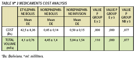 To the average of the cost analysis it is evidenced, a higher cost to use Ethylephrine in bolus 42,5 ± 8,36 (Bolivians) than to use norepinephrine in infusion 0,50 ± 0,15 (Bolivians) and norepinephrine in bolus 0, 45 ± 0,14 (Bolivians) there is a statistically significant difference. Group E and group NB (value P = 0,000), Group E and Group NI (value P = 0,000) and Group NB and Group NI (value P = 0,077). The total volume of vasopressors used during the surgical act is not statistically significant. See table 2.