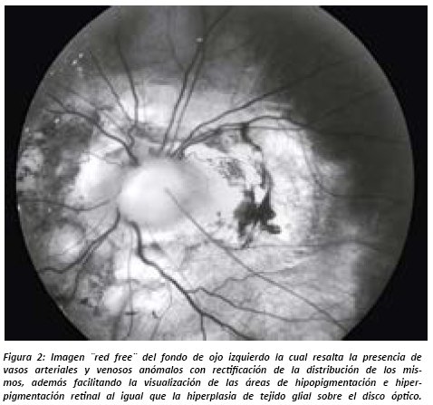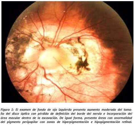 Clínicamente estos pacientes pueden cursar con cataratas, nistagmo, estrabismo, y drusas del nervio2. En su morfología ocular es particular, encontrar un disco óptico que puede estar ocupado por tejido glial, y su tamaño puede estar aumentado en el centro de una excavación peripapilar en forma de embudo, además de un anillo elevado pigmentado, también se encontraran zonas pobremente definidas, en conjuntos con un patrón radial con los vasos sanguíneos oculares con curso derecho sobre la retina periférica1-5.