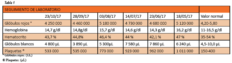 El reporte de laboratorio con hemoglobina 16,2 g/dl, hematocrito 47 %, plaquetas 1 011 x 103/ μl, glóbulos blancos 6 240 x 103/μl. Se realiza interconsulta con hematología y le realiza biopsia de medula ósea con reporte de hiperplasia de serie megacariocítica con megacariocitos gigantes, hiperlobulados compatible con una neoplasia mielo proliferativa crónica; biología molecular: JAK2 negativo. La trombocitemia esencial debe ser diferenciada del resto de las Neoplasias Mieloproliferativas crónicas por presentar un conteo elevado de plaquetas, presencia de la mutación JAK2 (que puede estar presente en la mitad de los casos), presencia de hiperplasia de megacariocitos, formas gigantes y displasia a nivel de la medula ósea y ausencia de otras enfermedades clonales que puedan estar asociados a otros problemas médicos que causan un aumento reactivo del conteo de plaquetas. También se solicita ecografía abdominal, la cual es normal, por todo lo mencionado anteriormente se demuestra el diagnóstico de trombocitemia esencial e inicia tratamiento con drogas citoreductivas como la hidroxiuria 500 mg cada día hasta el descenso de las plaquetas antes de la intervención quirúrgica. Además, se realiza control de plaquetas en forma mensual (ver Tabla 1).