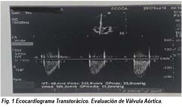 También se realiza interconsulta con Cardiología con reporte de electrocardiograma normal y ecocardiograma transtorácico (ver Fig. 1). Evaluación de válvula aórtica, el reporte menciona válvula aórtica bicúspide con estenosis e insuficiencia leve por el antecedente materno sin repercusión hemodinámica en la paciente. Con clasificación funcional de la Insuficiencia Cardiaca NYHA I (New York Heart Association).
