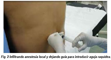 Se planificó anestesia regional raquídea (ver Figura 2). Infiltrando anestesia local y dejando guía para introducir aguja raquídea; la monitorización hemodinámica fue estándar, control de líquidos intravenosos estricto para no repercutir hemodinámicamente, se usó vasopresores si existía hipotensión posterior a la anestesia raquídea y se tomaron medidas antiembólicas, control de la hemostasia quirúrgica. No hubo complicaciones y/o incidentes durante el período intraoperatorio. Se indicó deambulación asistida y temprana en el período postoperatorio. El servicio de cardiología valora a la paciente en el mismo día postquirúrgico, el cual la encuentra normal con cambios hemodinámicos. Los recuentos plaquetarios posoperatorio fue de 429 x 103/μl, hemoglobina de 12,4 g/dl, hematocrito de 37,1 %, TP (Tiempo de Protrombina) 10,4 seg, INR 1,06. Paciente es egresada por el servicio de Hematología y Ginecología del hospital a los 2 días postoperatorio.