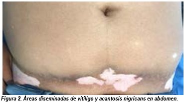 Masculino de 15 años de edad, originario del estado de Tlaxcala, en la República Mexicana, madre con antecedente de artritis reumatoide y abuela con osteoartritis y diabetes mellitus. La madre del paciente cursó embarazo a término (39 semanas), negando patología gestacional. El desarrollo psicomotor fue referido normal. El paciente inició con aparición de lesiones despigmentantes desde los 10 años de edad y a partir de entonces presentó incremento ponderal. Fue referido a medio hospitalario a los 15 años de edad para valoración por dermatologia, quienes diagnosticaron vitiligo e iniciaron manejo de primera línea con emoliente tópico, corticoide tópico e inhibidor de calcineurina. El paciente fue enviado a la clínica de obesidad pediátrica por cumplir el criterio de obesidad. A la exploración física se detectó acantosis nigricans en cuello, axilas y cintura, giba dorsal, deformidad en la alineación de rodillas (geno valgo), y también se observó áreas de despigmentación en párpados superiores (Figura 1), abdomen (Figura 2), codo derecho, articulación interfalángica de ambas manos (Figura 3).