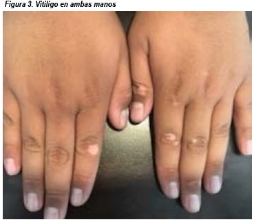 El vitiligo es una patología que se presenta con mayor frecuencia en mujeres, debido a que se cree que los estrógenos juegan un papel importante en la inmunidad. Se encuentra con mayor frecuencia en familiares de pacientes afectados por enfermedades autoinmunes2,4, como en la enfermedad inflamatoria intestinal, psoriasis, artritis reumatoide, diabetes tipo 1, lupus eritematoso sistémico, anemia perniciosa y TAI4. Como es el caso de nuestro paciente que cuenta con antecedentes familiares de artritis reumatoide por parte de la madre y osteoartritis y diabetes mellitus en abuela.