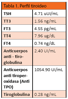 Conforme a lo anterior, como parte del manejo inicial en el paciente pediátrico con obesidad, se iniciaron modificaciones en el estilo de vida, orientando sobre hábitos saludables de alimentación y programa de ejercicio, evitando el sedentarismo, y continuando seguimiento multidisciplinario. Debido a las alteraciones comentadas de la función tiroidea así como los hallazgos reportados en el ultrasonido de cuello se solicitó valoración por endocrinología en donde se confirmo el diagnóstico de TAI. Deforma conjunta se decidió no iniciar tratamiento con levotiroxina, ya que el paciente no reunió criterios para el tratamiento farmacológico según lo recomendado en la literatura, debido a que la TSH no es superior a 10 Ui/mL y el paciente no presenta sintomatología compatible con hipotiroidismo7,8.